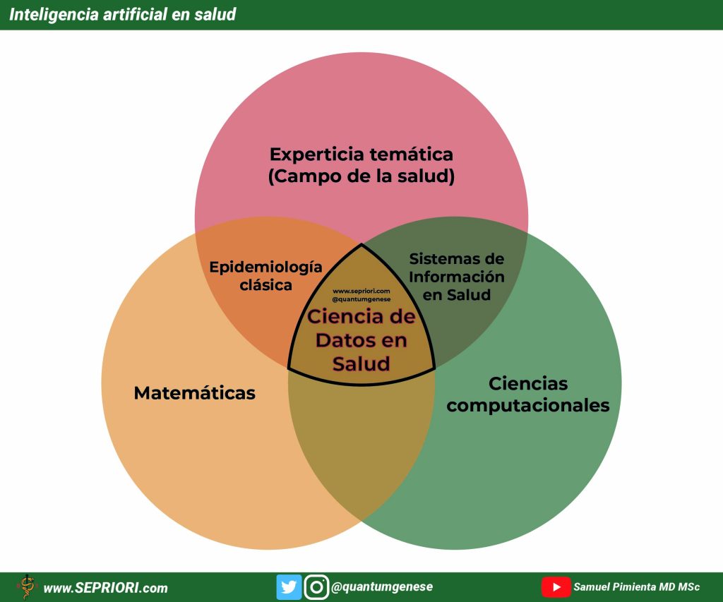 Esta amigable advertencia es un recordatorio de la ventaja de trabajar y pertenecer al campo de la salud y a su vez diseñar, crear, supervisar, ejecutar proyectos de ciencia de datos y/o inteligencia artificial en salud. Ventaja, ya que – como se mencionó en los Fundamentos de IA en salud – el éxito de un modelo de machine learning o deep learning se da en una amalgama que combina tres aspectos: experticia temática, ciencias computacionales y matemáticas.